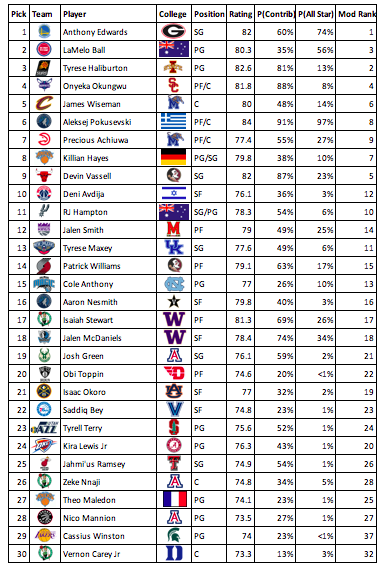The most interesting topic of debate for this years NBA Draft is who will go first overall. In most years, there is a consensus player who is thought to be the first overall pick, such as Zion Williamson last year. However, this year is different with several possibilities for the number one pick, such as LaMelo Ball, Anthony Edwards, Killian Hayes, or James Wiseman. Using the three models, Anthony Edwards seems to be the best choice for the number one draft pick. Edwards ranked the highest among the possible first overall picks in probability of becoming an all star and projected rating. He is a shooting guard from Georgia who has the ability to create on offense, but lacks defensive ability and is an average distributor. Edwards is first on the modified draft board and has the second highest chance of becoming an all star in the whole draft class, behind only Pokusevski. Moreover, he can be viewed as a risky player as his chance of becoming an all star is greater than his chance of becoming a contributor.