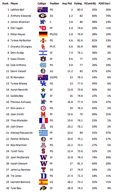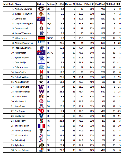I applied the three models to 38 different prospects from the 2020 NBA Draft. I chose prospects based on using five different mock drafts. Only possible first rounders were included. I created a human draft board by taking the average draft position of the prospects across the five mock drafts. The draft board is shown below. Then, I used the players’ stats as the inputs for the three models that I used. Keep in mind that for the ratings column, the r-squared was low meaning that most of the results will be near the average, which was about 77. Another facet of the statistics that may be confusing is that the probability of becoming an all star is greater than the probability of becoming a contributor for some players. This is because the sample did not include all possible players and stats, so some abnormalities are present. However, these players can be viewed as high risk players as the chance of being a role player but not an all star is low for them.
