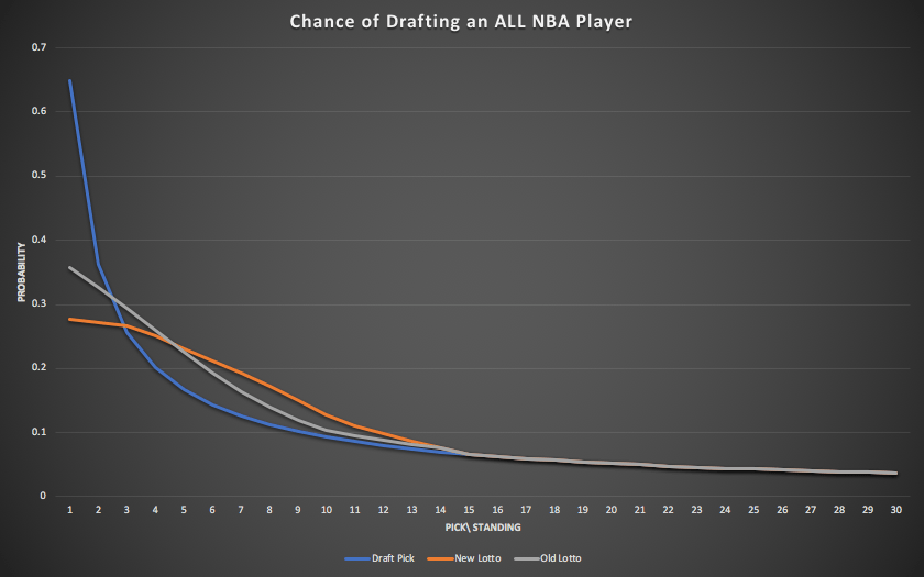 The NBA has new trends arise every year, with the new innovations and play styles allowing teams to expand possibilities and change the game. These trends can become widespread in the NBA, such as the rise of three point shooting and more fluid player movement throughout the association. However, one of the most controversial trends that have come to the attention of fans and executives alike is the concept of tanking. Tanking in the NBA is widely recognized as intentional losing in order to acquire high draft picks and have a greater likelihood of drafting a superstar. The event that brought tanking to the forefront of NBA conversation was Sam Hinkie’s infamous stint with the Philadelphia 76ers, where he implemented the most public, outright tanking job in NBA history. Hinkie traded all of his top talents for future draft picks, improving the team’s chances of procuring a premium draft pick with a high probability of getting a superstar. The NBA has tried to prevent tanking with NBA Draft Lottery reforms such as the new format in which the top 3 picks all have the same chance of winning the number one overall pick. However, this has not stopped teams from trying to purposefully lose in order to improve their draft pick quality. But I want to know how effective tanking really is. What is the probability behind gaining a high draft pick and that pick becoming a great NBA player?