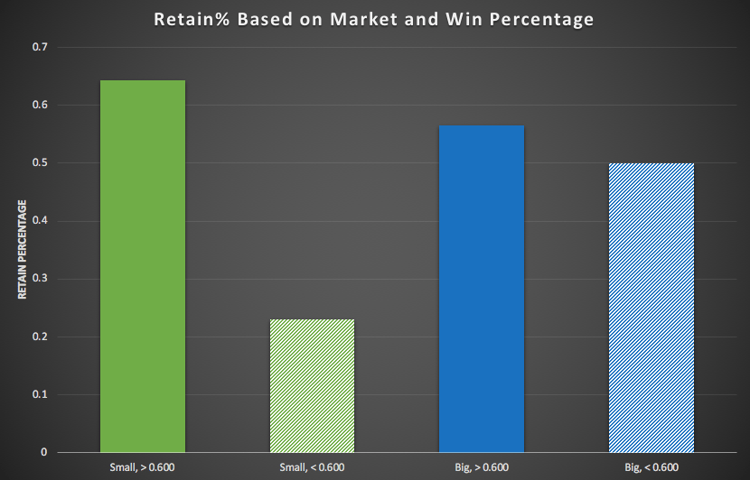 However, these results overlook the other important component: team success. Since the Bucks have been a top team in the NBA for the past two seasons, they theoretically should have an advantage since it should convince Giannis to stay as he has a chance to win a championship. The retention rate for good teams (above 0.600 win%, which is 50 wins in 82 game NBA season) is 59%, whereas it is 37% for bad teams. This difference is greater than that of the small market and big market teams, meaning that success will be a major advantage to the Bucks’ case of keeping Giannis.