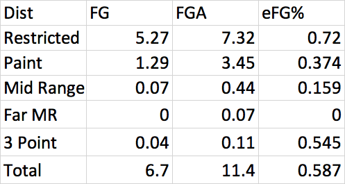 Simmons takes about 64% of his shots in the restricted area, converting them at a 72% rate. However, his efficiency drops off severely outside of the restricted area, making only 37% of his shots in the paint (excluding restricted area) and only 16% of his mid range shots. His three point percentage is so high because he has made 1 of 3 this season, so it is 33% right now (the eFG% shows 0.545 because it has a weight of 1.5 for 3 pointers and because of rounding error). The breakdown of his shots shows that Simmons should take more of his shots in the restricted area as he is wasting possessions by taking inefficient shots like paint and mid rangers.