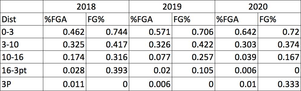 Here are Ben Simmons’s shooting stats across his three seasons based on shot distance. His efficiency from the paint (3-10 feet) has decreased by a lot this year, which is probably an anomaly due to the addition of Al Horford who further clogs up the paint. Additionally, both his shooting percentage and percentage of shots from mid range has decreased every year. As a result, we can see that Simmons is trying to avoid the least efficient shot in basketball and instead attacking the rim more. These results are promising as Simmons is trying to take better shots, but not promising because they don’t give any reason to believe that he can shoot 3 point shots well.