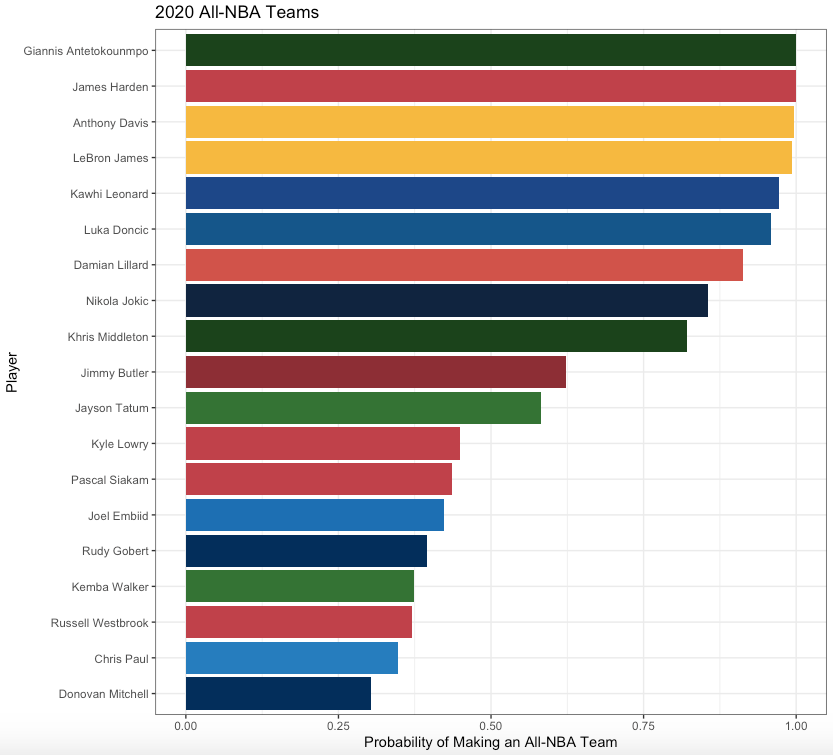 Using ESPN’s Zach Lowe’s All NBA team predictions, we can find some players that the stats like more than normal. The first thing that stands out when looking at the statistical All NBA teams compared with Zach Lowe’s is that the first team is exactly the same, meaning that the stats and Lowe agree with the very best players. However, the second team has some differences, with Luka Doncic at the forward position (he is eligible for both the forward and guard position), replacing Khris Middleton while Chris Paul takes his spot. Meanwhile, the third team has more differences, with Ben Simmons, Khris Middleton, and Rudy Gobert replacing Kyle Lowry, Kemba Walker, and Joel Embiid. While the model thought the Gobert was neck and neck with Embiid for the third center spot, it did not think Simmons had a case for All NBA at all, giving him just a 13.7% chance to make one of the three teams.
