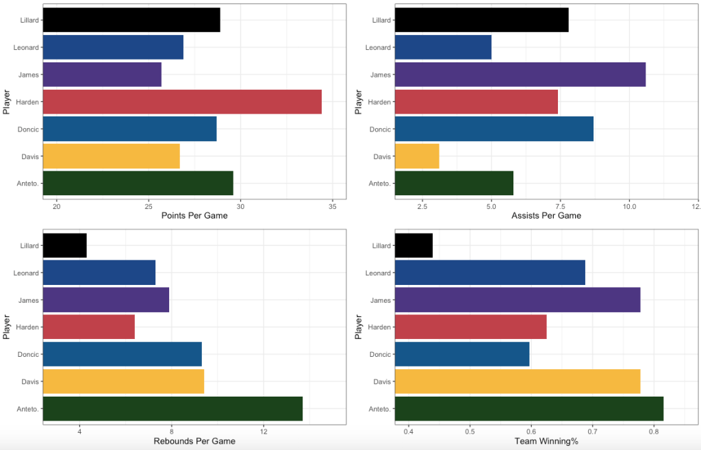 The first comparison I will look at is the most simple one: per game statistics. I chose seven players for these comparisons and the future ones, choosing the players based on who I think are the most likely to get votes. The average statistics give a nice general overview of player performance, but miss key components of a player’s impact, such as how much better they make their team while they are on the court. James Harden leads the scoring category by a large margin, with Antetokounmpo and Lillard following. Giannis Antetokounmpo’s stats are even more impressive due to his 30.9 minutes per game, a small number for a modern day NBA superstar. Meanwhile, the rebounding category is lead by Antetokounmpo and the assist category is lead by LeBron James, the other front runner. Finally, team winning percentage is a crucial part of an MVP’s resume as historically the best players on the best teams win the award. The Bucks and Giannis lead this category, with James, Davis, and the Lakers right behind them. Giannis is the player that stands out most by looking at just per game stats, ranking 1st among the candidates in win percentage and rebounding, while ranking 2nd in points even with under 31 minutes a game.