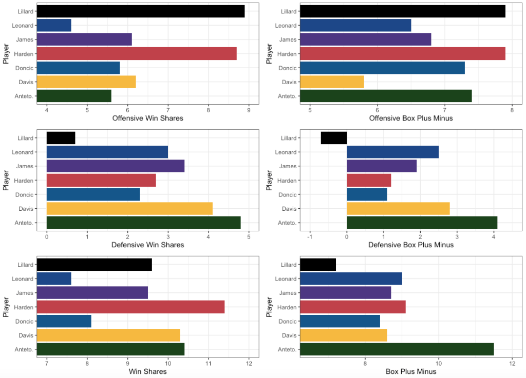 Win Shares and Box Plus Minus (BPM) are the stats featured in this section. Both are split into offensive and defensive categories, with a cumulative stat measuring total combined offensive and defensive impact. Looking at these graphs, Harden and Lillard seem to have a significant advantage offensively while Davis and Giannis have the largest defensive advantages. Meanwhile, Doncic, Leonard, and James seem to have equal effect on both ends of the floor. If you look at the scale for the offensive and defensive win shares and BPM, you can see that defense has a smaller impact overall. Giannis again stands out in these graphics, ranking 1st in BPM and 2nd in win shares. Meanwhile, James ranks 4th in BPM and 5th in win shares, showing that the advanced stats favor Giannis over LeBron.