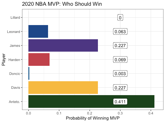 Of the seven front runners, it seems that only 5 have an actual shot at winning (meaning over 5%). Doncic and Lillard were heavily hampered by their team records, with the Trail Blazers ranking around 10th in the West and the Mavericks ranking around 7th. Meanwhile, the three players with the best shots of winning are Giannis, LeBron James, and Anthony Davis. As you can see, Giannis has about 40% while James and Davis each have about 23%. Giannis’s high numbers in both win shares and BPM, combined with his high usage and being on the team with the best record in the NBA, gave him a significantly higher chance than all of the other players. One surprising result was Anthony Davis, who actually ranked above James in the probabilities (by under a one hundredth of a percent). Davis and James had similar numbers for BPM and usage rate, but Davis’s significant advantage in win shares is likely what put him in second place.