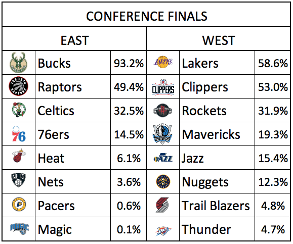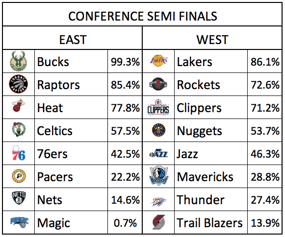 The defending champions will face the Nets in the first round. The Raptors have thrived despite the loss of Kawhi Leonard with a stout defense which forces opponents to shoot poorly and turn the ball over. The Raptors do not have one great player, but rather several good players, which does hurt them in the model a little bit. The Raptors should easily take care of the Nets, winning in 5 games.