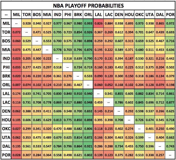 Using the results of all the playoff teams, I constructed a table to give the probability of any playoff team in a series against any other playoff team. By going through all of the possible playoff bracket results and using the series win probabilities, I then found the chances of each team advancing to a certain round. The table should be read by taking the row of the team and the column of the opponent, where the corresponding number represents the probability of the team beating the opponent in a seven game series.