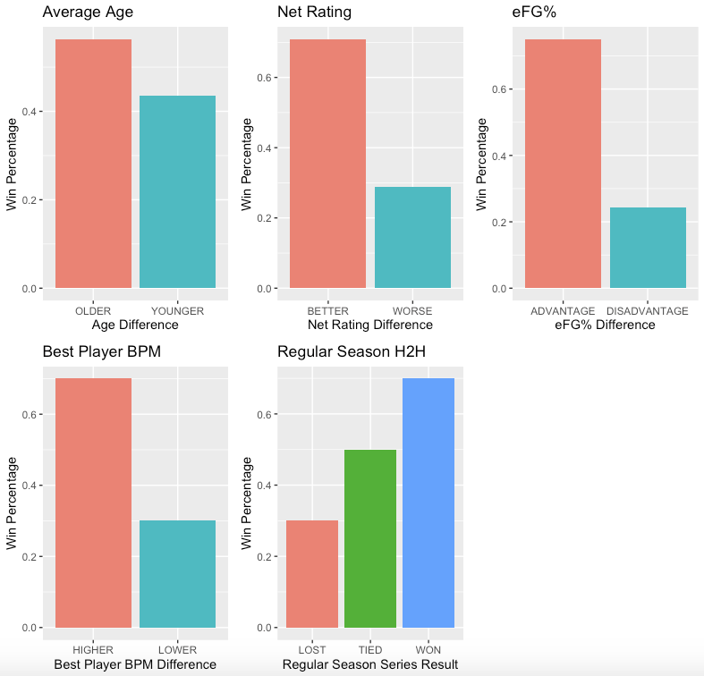 First, I chose which variables I should use. I came down to five different inputs: average age difference, net rating difference, eFG% advantage, best player BPM difference, and regular season head to head difference. I used differences for each variables in order to reduce the number of variables needed as inputs. The average age component gives some insight into how experienced a team is as more experienced teams often have better playoff success. The net rating difference gives a quick overview of regular season performance and the best player BPM difference shows which teams have truly dominant players that can take over a game. The eFG% advantage is a one number summary which basically summarizes how good a team is a shooting the ball and defending shots. The formula is [(team offensive eFG% – opponent offensive eFG%) – (team defensive eFG% – opponent defensive eFG%)]. Finally, the regular season head to head difference is the number of regular season head to head wins minus losses. This input helps find certain teams that struggle against others because of matchup problems or other factors that cannot be accounted for in the model. It also gives some variability to the model by not giving it a definite hierarchy. For example, this year (according to the model) the Heat are more likely to beat the Raptors than the Celtics, whereas the Bucks are more likely to beat the Celtics than the Raptors.