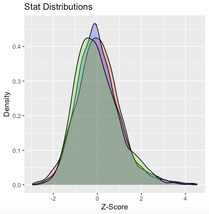 After finding the three main stats for the players in each season, I standardized them based on position in order to account for positional biases that are present in some of the stats (most notably big men in WS/48). For example, the top 15 among qualifying players in win shares per 48 minutes last season consisted of 8 centers and 2 power forwards, placing players like Enes Kanter and Jarett Allen over stars like Luka Doncic and LeBron James. After standardizing, however, the top 15 had a more uniform mix of positions, with only 5 of the original 10 big men. The distributions of all three statistics were very similar as they all were slightly right skewed, displaying the effect of superstars in the NBA as all-NBA caliber players were consistently over 2 standard deviations above the mean.