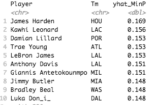 Next, after summarizing the effectiveness of each player, I had to estimate how often each would play. I used a multiple linear regression model to find the predicted minutes percentage based on per game statistics. The model used inputs such as field goal attempts, offensive rebounds, steals, turnovers, personal fouls, and points (all significant variables) to estimate the percentage of total minutes that the player played on a per game basis. While the projections below may look low for some notable high usage players like James Harden and Damian Lillard, no projection should be above 20% since there are always five players on the court. Additionally, a minutes percentage around 15%, which is close to most of the players below, equals about 36 minutes a game over the course of a full season.