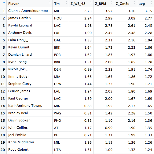 To include the fact that players will improve if they are very young, I took another step after finding the z-scores of the three main stats. I used a two variable linear regression to predict the subsequent year’s z-score for each of WS/48, BPM, and Game score, using age and current z-score as the two variables. This way, the older players were projected to regress while the young players had improved ratings. To have a quick summary of the results, the top 20 projected players for next year based on their average z-score of WS/48, BPM, and game score is shown below. The results seem to make sense using the eye test, with those who are traditionally regarded as the best placing highly.
