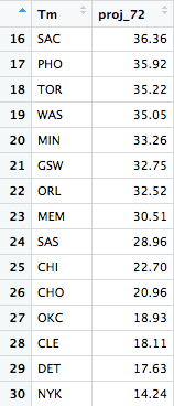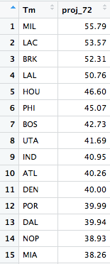 The final predicted number of wins for each team based on player stats are shown below. (The win projections are scaled for a 72 game season for this year as opposed to the normal 82 game season)