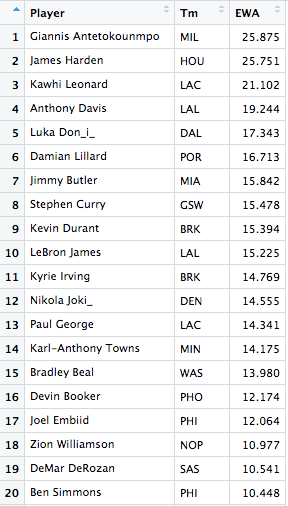 Lastly, to construct a method of comparing the impact of players against each other, I calculated the estimated wins added by each player. The exact calculation uses a combination of the minutes percentage, average z-score, and league average z-score (which isn’t 0 since I kept only the top 8 from each team). With these values, I can investigate how impactful a player is over a typical player. The most estimated wins added (I’ll use EWA from now on) was Giannis, with 25.88, while the person with the least was Dennis Smith Jr, with -2.88 EWA. The typical player, found by taking the median, had around 3.88 EWA, so in order to see what the estimated record of a team without a certain player would be, you would subtract the player’s EWA from the team’s total projection, then add 3.88. For example, the Bucks estimated record without Giannis would be 55.79 – 25.88 + 3.88 which is 33.79, good for 20th in the NBA.