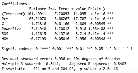 I chose the variables for the regression using what the CFP website says the selection committee uses to rank teams. First, I included win percentage as only teams with very good records have ever made the playoff. Then, the next variable incorporated was strength of schedule, gathered from college football reference. The strength of schedule on college football reference is calculated using margin of victory instead of win percentage, with the value indicating the points above or below average. Next, average margin of victory (MOV) was included in order to better represent the team’s actual skill (since an undefeated team with a large MOV is much better than an undefeated team with a lower MOV). The last two variables consisted of total games played and a dummy variable representing whether the team belonged to a power five conference. The total number of games played was included for two reasons: 1. to give a boost to teams that made their conference championship game, adding an extra game, and 2. to try to see how important Ohio State’s lack of games played this year should have affected them. Lastly, the power five dummy variable had a value of 1 if the team was in a power five conference or was Notre Dame (because while they are independent, the committee essentially treats them as a power five team) and a value of 0 if the team was an independent or part of a group of five conference. This variable helped to account for the committee’s tendency to favor power five teams greatly compared to group of five teams. Including a variable accounting for whether or not a team was a conference champion was not significant, meaning that the committee does not value it as strongly as they suggest.