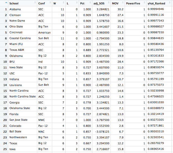 After I applied the first regression giving the probability of being ranked by the CFP committee, I took the top 35 teams and applied the linear regression to predict what their CFP rank would be. From that, I could take the top 25 teams and rank them in order to show how the committee should have ranked them based on their past rankings. The formulas for the two regressions are below.