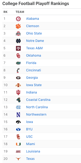 The actual CFP rankings are shown below. Only the top 20 teams are displayed.