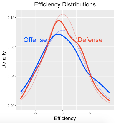 Adjusting for strength of schedule was done by averaging the raw offensive and defensive efficiency faced for each team. Then, the adjusted offensive efficiency was calculated by adding the raw offensive efficiency and the average defensive efficiency faced, and vice versa for adjusted defensive efficiency. This way, offenses that played good defenses were rewarded, while offenses that played bad defenses were penalized (and vice versa for defense). Finally, offensive and defensive rating were found by multiplying the adjusted offensive efficiency and adjusted defensive efficiency by 10, since NFL teams usually have close to 10 possessions per game.