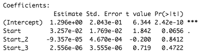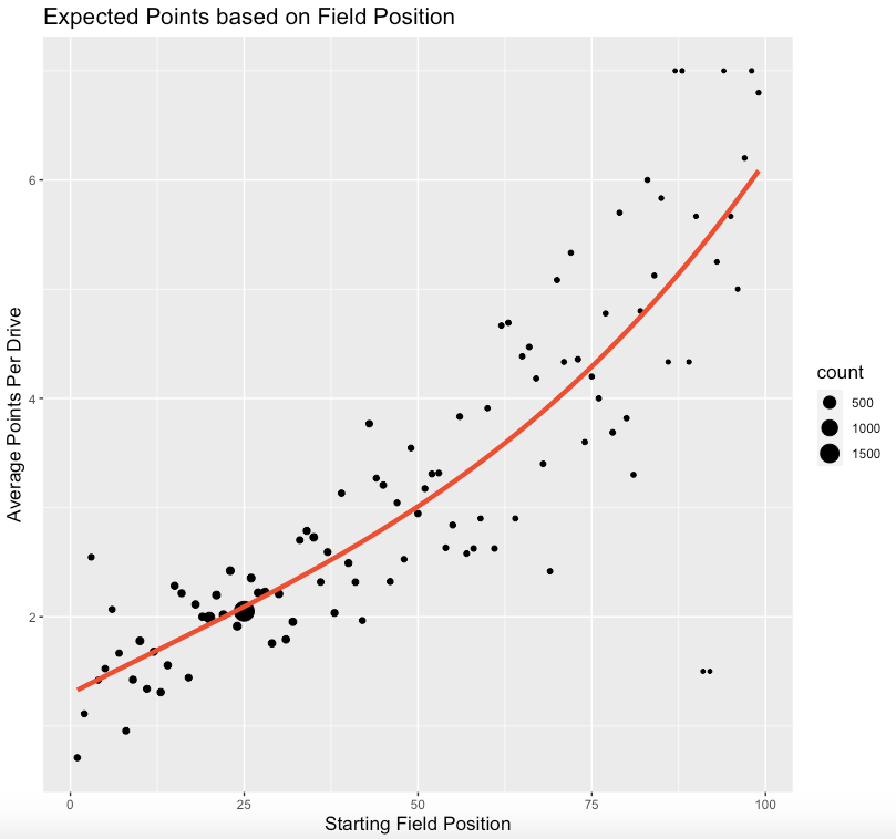 In order to see the effect of field position on points per drive, I plotted the average points per drive for every starting field position this season, excluding drives consisting of only QB kneels. Then, I used a cubic regression to give every starting field position an expected points per drive value. The graph and regression output are shown below. From this, we can see that not all possessions all equal. For example, a possession that start at a team’s own 25 yard line is expected to score about 2 points on average, while a possession starting at the 50 yard line is expected to score about 3 points on average. The values do not move linearly, though, since if a possession starts within the opponent’s 5 yard line, it is expected to score close to 6 points on average.