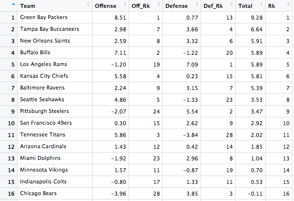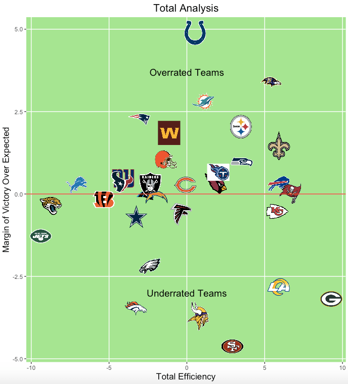 Using the total efficiency, the Colts and Ravens were the most overrated teams by points per game. The Colts had a margin of victory of 5.6 when they should’ve had a margin of victory closer to 0.7, and the Ravens had a margin of victory over 10 even though they should’ve had a margin of victory closer to around 7. Meanwhile, the 49ers, Vikings, Broncos, Packers, and Rams all should’ve had larger margins of victory than they did. The Rams and Packers may be sleepers teams in the playoffs because of this, while the Colts and Ravens may have early exits.