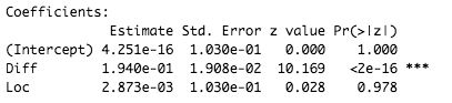 One further application of the NFL offensive and defensive ratings would be using them to give the probability of a team winning against a certain opponent. In order to accomplish this task, I used the data from all 255 non-tied games this season and applied a logistic regression with two inputs: the difference in total rating and a home field advantage variable (equalled 1 for home, -1 for away). The regression output for the log odds are shown below.