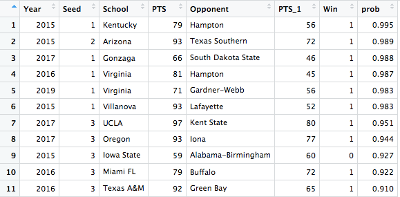 The next table shows the games including seeds 1 through 4 in the games they were least expected to win. The model was unable to predict any upsets by 15 or 16 seeds, so it is not very reliable when it comes to picking those teams to win in the first round. However, it does have success in picking 3 or 4 seeds that may be vulnerable, including West Virginia in 2016, Baylor in 2015, and Wichita State in 2018. Not many predicted those teams to lose in the first round, but the model had them on upset alert.