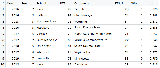As expected with such high seeded teams, the ones that were predicted to win won most of the time, with the only exception in the list being Iowa State’s loss to UAB. Additionally, the model did not see UMBC’s win over Virginia or Middle Tennessee’s win over Michigan State at all, even though they are not shown.