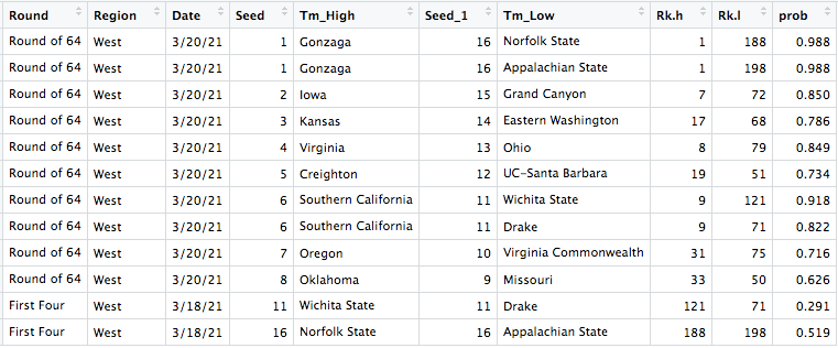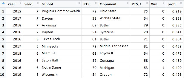 As we saw above, the model has had previous success picking 3 or 4 seeds that could be upset in the first round, but not 1 or 2 seeds. Now, we can see how it predicts first round games including seeds 5 through 8, which are games in which upsets are much more common.