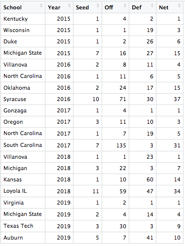 All of the final four teams except for the three most unexpected (2016 Syracuse, 2017 South Carolina, and 2018 Loyola Chicago) were in the top 15 of the SABER rankings. Additionally, 36 of the 40 teams were in the top 10 of either offense or defense. Every year with the exception of 2018 had at least 2 of the top 5 teams in the Final Four. Even in 2018, when only 1 of the top 5 teams made the final four, Michigan was ranked 7th overall. Also, it is important to note that the number 1 team based on SABER made the final four every year except for 2016, when Michigan State was the number 1 team based on SABER but they lost in the first round.