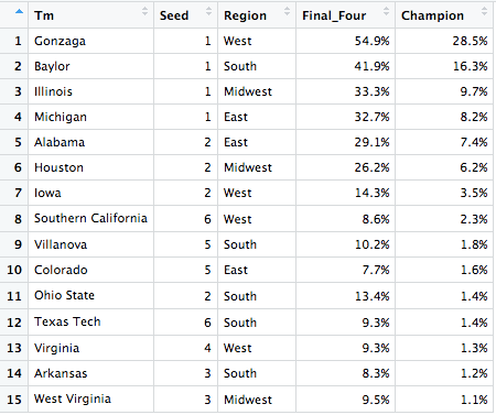 Using 1000 simulations based on each school’s SABER rating, I found the probability of each team winning the NCAA tournament and making the Final Four. The results for the teams with the best chances of winning the championship are shown below.