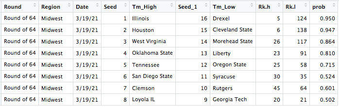 The last region is the Midwest (bottom right) region, led by Illinois. This is by far the weakest region according to SABER with only 3 top 20 teams. The 8-9 matchup is fantastic, as both Loyola and Georgia Tech are in the top 21 of SABER as low seeds. An upset candidate is Syracuse, having just a 50% chance to beat San Diego State. Illinois and Houston are the only Final Four candidates and only championship contenders from this region.