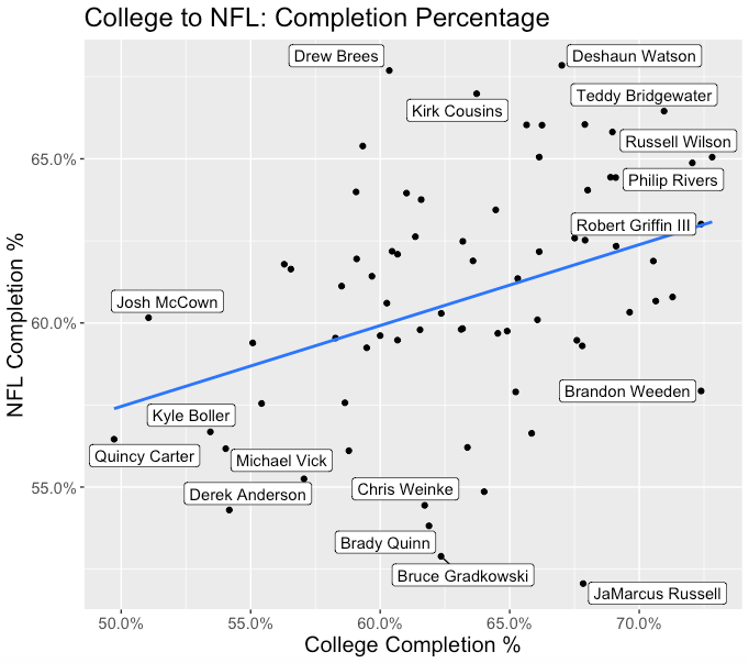 The most consistent quality from college to the NFL is accuracy. The most common statistic to determine accuracy is completion percentage. Of course, it does not completely account for accuracy because the simple calculation of completion percentage cannot account for the fact that certain quarterbacks attempt more difficult throws than others. While some sites attempt to consider the difficulty of pass attempts using a completion percentage over expected metric, the simple completion percentage stat is more accessible and simpler to use and understand.