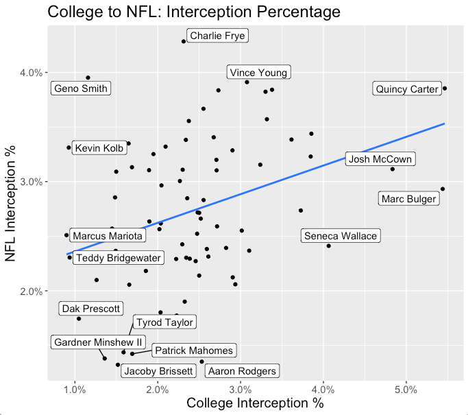 After accuracy, the second most consistent passing quality from college to the NFL is turnover rate. Interception percentage can be used to measure how turnover-prone a quarterback is in both college and the NFL. Again, interception percentage is a simple stat using only the number of interceptions and the number of attempts, so the pass difficulty was not accounted for.
