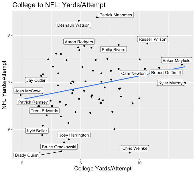 For each of the graphs and models that are shown in the remainder of the article, the sample of players consisted of all quarterbacks drafted from 2000 to 2020 with at least 20 games started. No FCS quarterbacks (e.g. Joe Flacco and Carson Wentz) were included as their college statistics would have been skewed from playing with such inferior competition. This produced a sample of 78 quarterbacks, each with a sizable sample of pass attempts as they started several games.