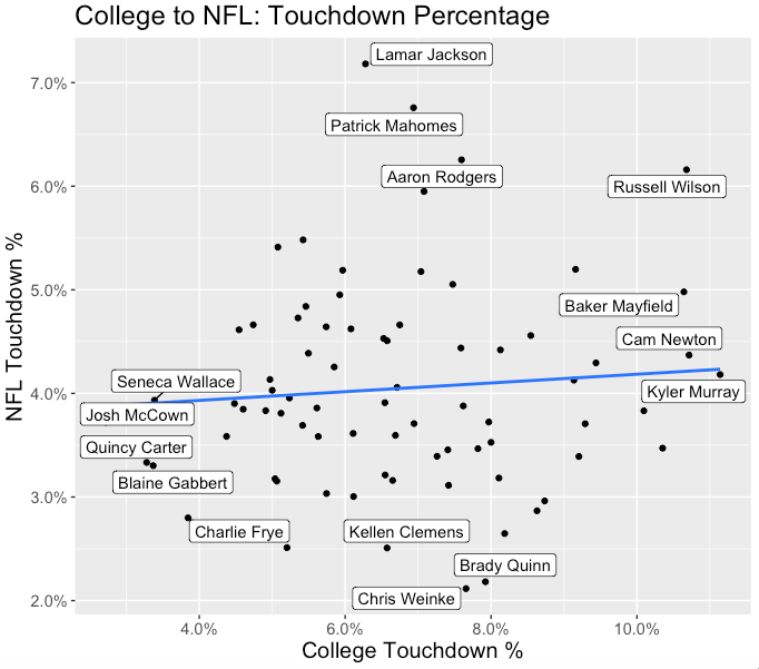 The least correlative stat from college to the NFL was touchdown percentage. Touchdown percentage measures how often a quarterback scores by throwing the ball.