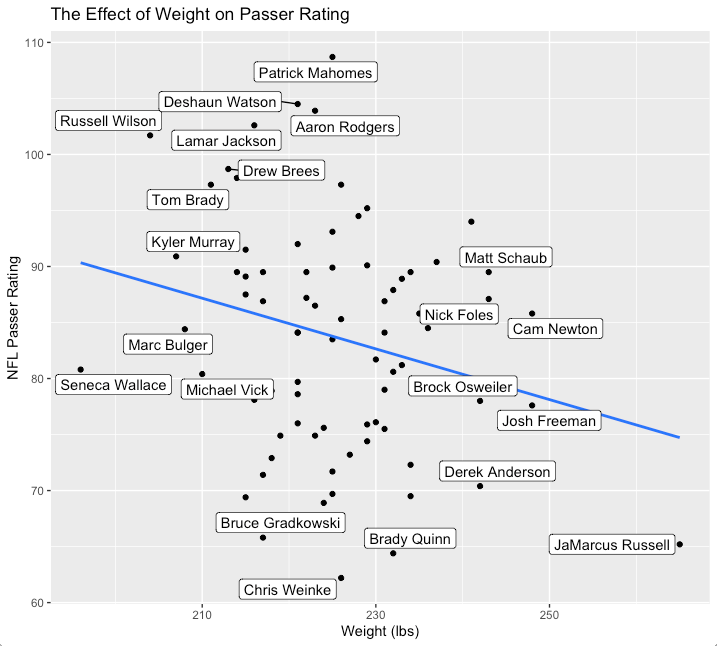 First, we can analyze the importance of weight on NFL performance. Draft scouts generally warn against quarterbacks that are too light or too heavy. This makes sense as those who are too light would be very likely to take sacks and get injured, while those who are too heavy would be unable to navigate the pocket very well. However, the sample of 78 quarterbacks drafted over the last 20 years shows a different trend.