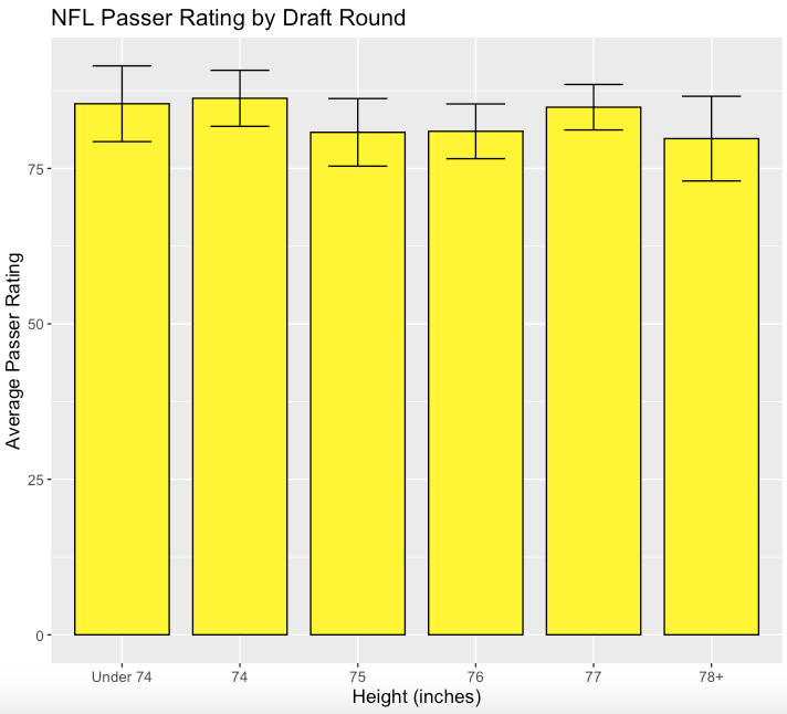 When draft scouts discuss the height of a quarterback, they often say that players that are smaller would have a harder time throwing over their offensive linemen and seeing the field. However, just like weight, we can evaluate the truth of that claim. By examining how impactful height is on NFL passer rating, we can detect the true importance of height.