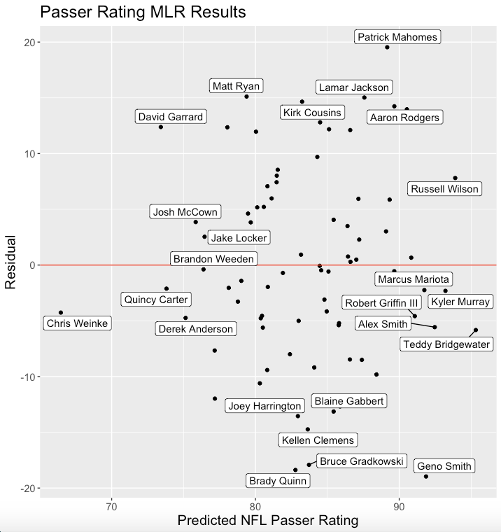 The NFL Passer Rating model had several successes and failures within the sample. The most well-liked players by the model were Teddy Bridgewater, Russell Wilson, and Kyler Murray. Bridgewater was worse than his expected 95.3 passer rating, but Wilson met and exceeded his expectations. The model also successfully predicted that Chris Weinke would not be good in the NFL because of his age. On the other hand, some of the misses included Matt Ryan, who was better than expected, and Geno Smith, who was worse than expected.