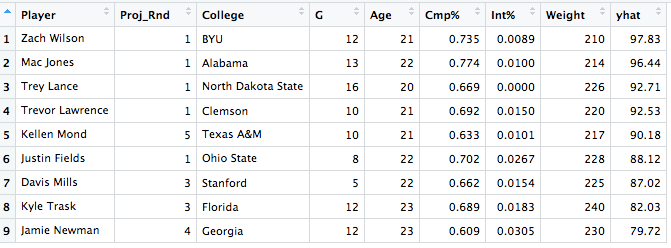 Now that I have made a model that can help to predict how good a quarterback’s passer rating will be in the NFL, I can apply the model to the quarterback prospects for 2021. The predicted NFL passer rating for 9 quarterback prospects in the 2021 NFL Draft are shown below.