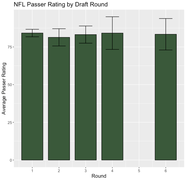 Surprisingly, the quarterbacks drafted in later rounds had the same average passer rating than the quarterbacks drafted in early rounds, such as round 1 or 2. However, the sample sizes for each round except round 1 included less than 10 players. This means that very good outliers, like Russell Wilson in round 3 or Dak Prescott in round 4, had a large effect on the mean value. Meanwhile, the sample of round 1 quarterbacks included 37 players, with a balanced mix of good players and bad players.