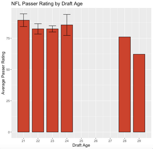 Of the quarterbacks in the sample, all but 2 were between ages 21 and 24 when they were drafted. The two outliers were Chris Weinke (age 29) and Brandon Weeden (age 28). Both of these quarterbacks did not perform well in the NFL, with passer ratings of 62.2 and 76.0, respectively. Of the quarterbacks who were between 21 and 24, those who were 21 on the day of their draft performed the best, on average. Therefore, it is reasonable to assume that younger quarterbacks are better to draft than older quarterbacks on the day of the draft.