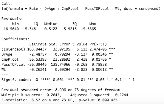 Now that we have explored the effect of several stats and traits on the future of a quarterback prospect, we can combine them to get an overall picture of how successful a quarterback may be. Since the sample size of quarterbacks was very low, I did not want to include too many variables in order to avoid overfitting. Eventually, I settled on four inputs for the regression. The first input was completion percentage, which was found to be predictive of future NFL completion percentage, one of the inputs into the NFL passer rating formula. Secondly, I included college interception percentage as it shows how turnover prone a quarterback is. Unfortunately, this variable is not very significant in the regression due to its collinearity with college completion percentage. After that, I included the weight of the quarterbacks since it was shown that quarterback prospects that weigh less generally perform better. The last variable I included was draft age, since younger quarterbacks traditionally have a better NFL outlook than older ones. The variables, coefficients, and significance levels are shown below.