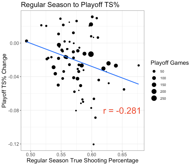 You may have realized that the list of the best shooting improvements in the playoffs consists of players that have less shooting ability than those on the worst shooting improvements list. There is a reason for this phenomenon. Players who traditionally have a high regular season True Shooting Percentage see the largest regular season to postseason drop-offs.