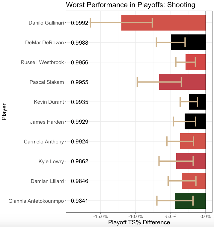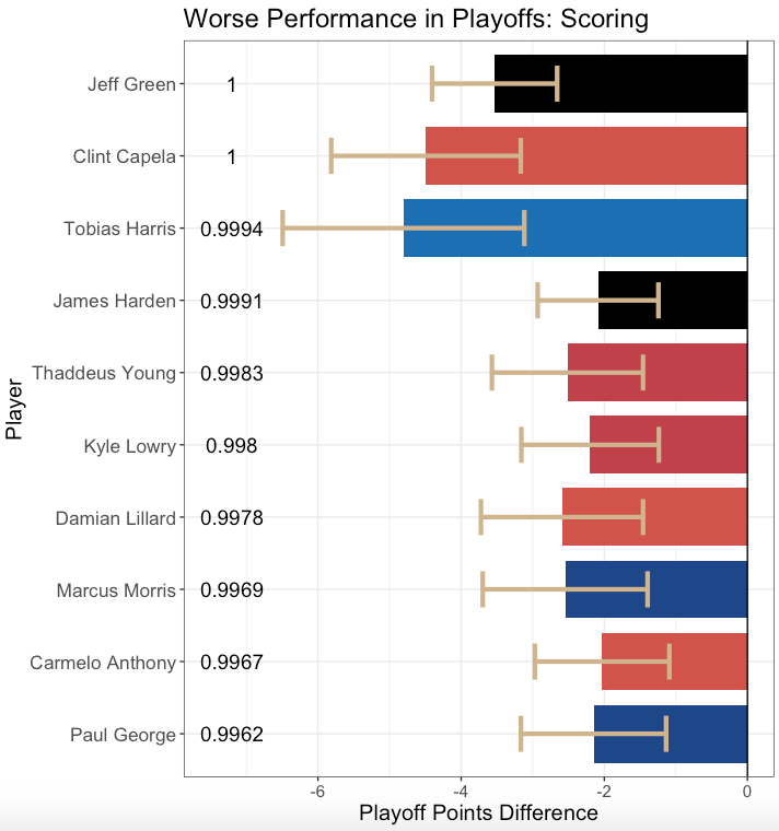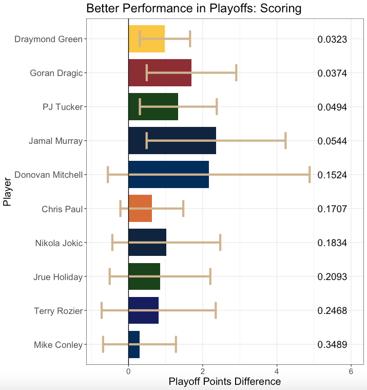 For those that score significantly less in the playoffs, the highest p-values are shown above. These players have consistently scored much less in the playoffs than their counterparts. High usage players in this category include James Harden, Kyle Lowry, Damian Lillard, and Paul George. Several of these players have been on teams with struggles in the playoffs, and their inability to increase their scoring during the playoffs is likely a reason for these struggles.