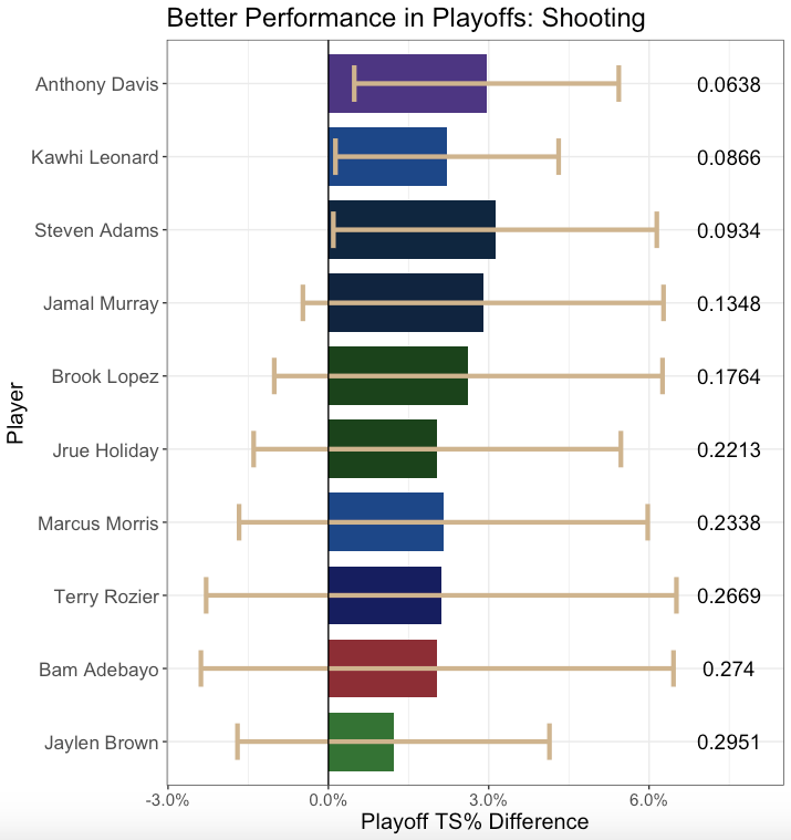 Just as some players increase their scoring in the playoffs, some players increase their shooting in the playoffs. The three players that have a significant improvement in true shooting percentage from the regular season to the playoffs are Anthony Davis, Kawhi Leonard, and Steven Adams. Davis and Adams had larger increases than Leonard, but Leonard’s consistent improvement in shooting over more than 120 playoff games allowed him to have a significant result.
