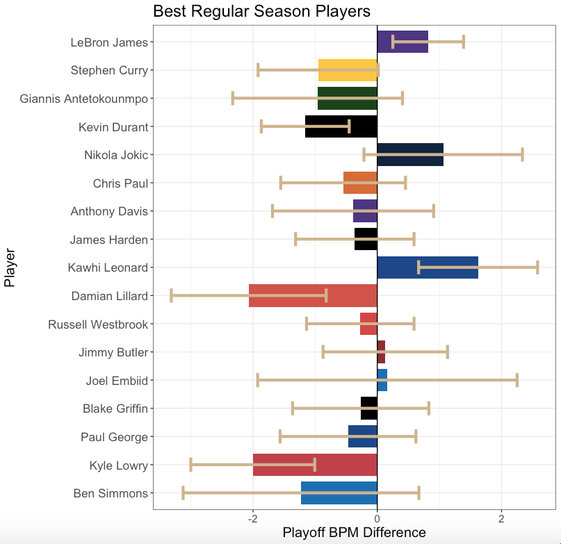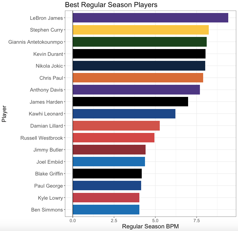 Although the graphs above show the improvements from the regular season to the playoffs of BPM for several players, it does not show all the best players. The graph below shows the best players in the NBA according to the regular season averages of BPM in the sample of games used.