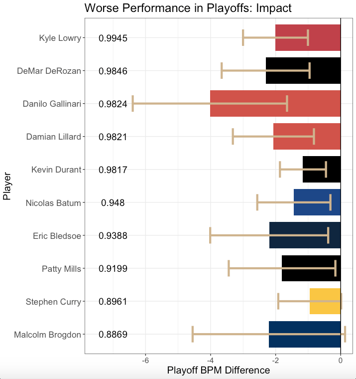 While there are several that improve significantly in the playoffs, others have a significant decrease in BPM during the playoffs. These include stars like Damian Lillard, Kevin Durant, and Stephen Curry. Lillard, has a decrease from 5.27 BPM (10th) in the regular season to 3.20 (24th) in the playoffs. Curry falls from a regular season BPM of 8.24 (2nd) to a playoff BPM of 7.29 (6th). Similarly, Durant has a regular season BPM of 8.04 (4th) and a playoff BPM of 6.87 (8th). The importance of these findings are that Steph Curry is unlikely to be able to propel the Warriors, a current 9th seed to a competitive series against a 1 or 2 seed, and Damian Lillard is unlikely to be able to win a first round series as a low seed.