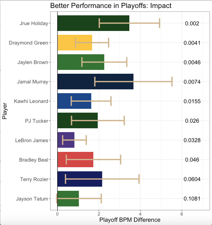 Although scoring and shooting are very important, the ultimate goal in the playoffs is to win. The best way to win is to impact the game at a high level. When it comes to impact, there are 9 players that significantly improve during the playoffs. This includes lead players like Kawhi Leonard, LeBron James, and Bradley Beal as well as role players, like PJ Tucker and Terry Rozier. One common theme among these players is that have have traditionally had postseason success: All the players that had a significant improvement in BPM during the playoffs have made a conference finals except Jrue Holiday and Bradley Beal. The ability to get better in the playoffs is the reason that LeBron James and Kawhi Leonard are heralded as some of the best players in the NBA. (The top 3 players in playoff BPM average are LeBron James, Nikola Jokic, and Kawhi Leonard)