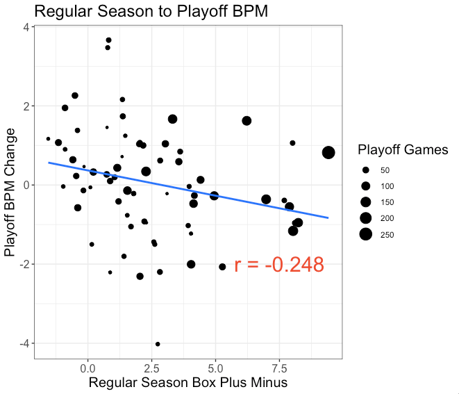 Similar to true shooting percentage, BPM also has a correlation between regular season averages and playoff changes. As players get increasingly better, they are more likely to get worse in the playoffs, according to BPM. However, there are several exceptions, like LeBron James, Nikola Jokic, and Kawhi Leonard, each of whom had a better BPM in the playoffs despite impressive regular season averages.