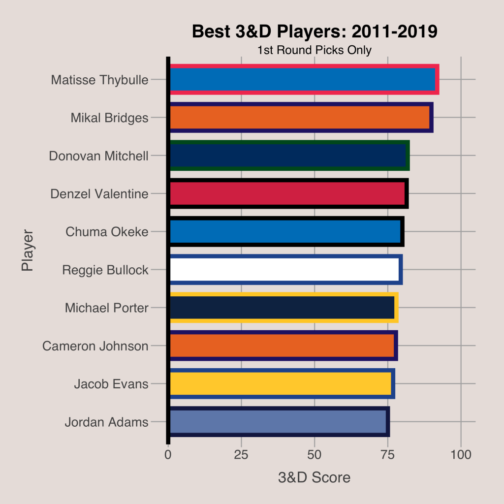 After I constructed models to predict future three point shooting and defensive ability, I needed to find a way to combine the two to create a value that evaluates the 3 and D potential of a player. I wanted a metric that would value shooting and defending equally, but would also incorporate the fact that 3 and D players have to be good on both sides of the floor. Therefore, I created the 3 and D Score, which was the 100 times the geometric mean of the percentile of the predicted 3-point percentage and the percentile of the predicted defensive box-plus minus. The 3 and D Score can range from 0 to 100. The geometric mean is a better choice than the arithmetic mean because it places higher importance on being good at both shooting and defense. The best 3 and D players from the 2011-2019 sample are displayed below using the 3 and D Score.